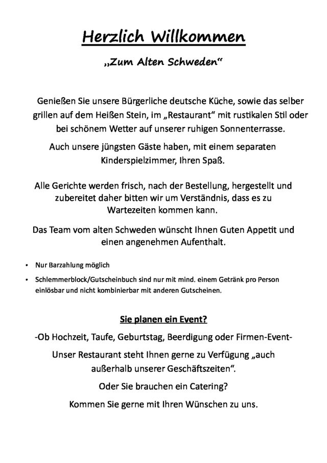 SUNĂ +497083924133Sie möchten essen gehen und sind auf der Suche nach dem geeigneten Restaurant? Dann kommen Sie zu uns ins "Restaurant Zum Alten Schweden". Unser Restaurant liegt sehr versteckt, im Dobeltal Bad Herrenalb, beim Autohaus Müller. Parken Sie bequem auf unseren kostenfreien Parkplätzen gegenüber vom Autohaus.